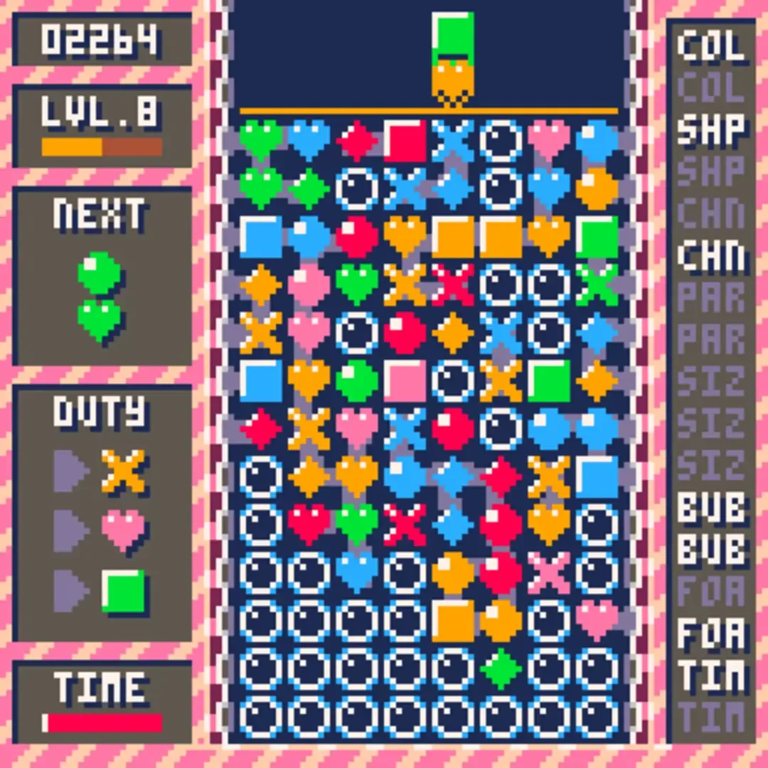 A puzzle PICO-8 game by benjamin_soule in which the player must group blocks of the same pattern and/or color and clear the screen.