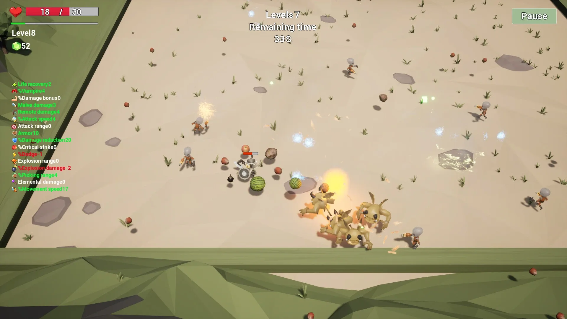 This is a top-down automatic shooting light ROGUE game. You will use various fruits to fight. Pick up the fruits to destroy the enemies!