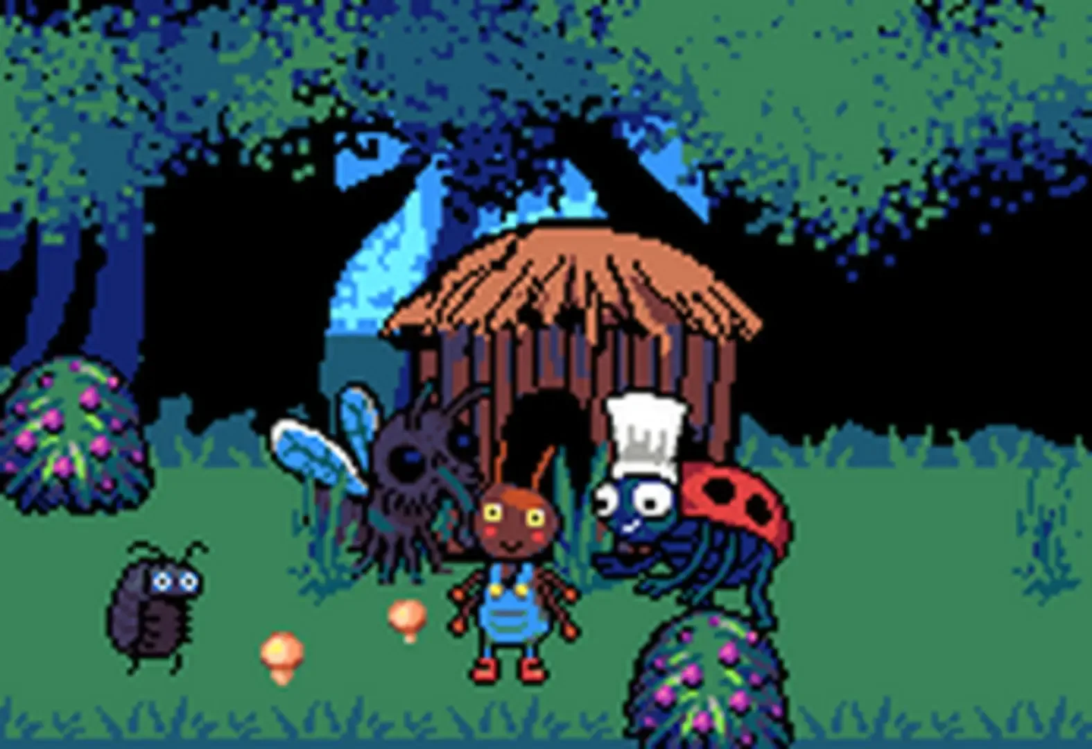 Care for a little village of cute lil bugs! Explore the forest, forage for food, gather resources, construct little houses and buildings, watch the little village grow and try to keep everyone happy! How many bugs can you care for? How many bugs is too many bugs?