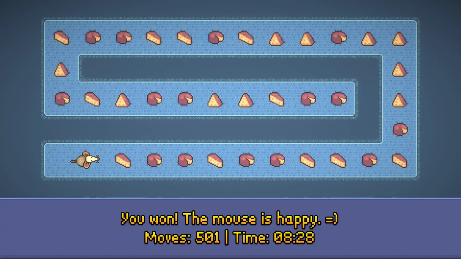 We all know that mice really love cheese. Guide the little mouse through 30 short levels and help her collect all the cheese pieces on the way. Watch out for tiny holes in the floor. If your mouse falls inside, you have to start the level from the beginning. Complete all 30 levels for victory. A short and fun experience that can be enjoyed by players of all ages.