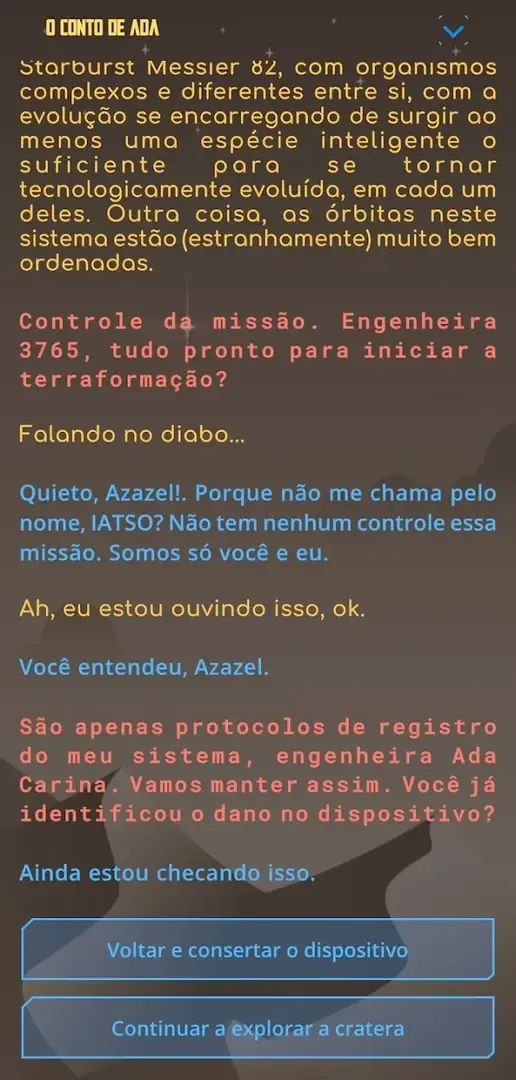 O Conto de Ada is a textual mobile game, based on an original science-fiction story, where your choices define your paths within the game. Through an immersive narrative and soundtrack, you take on the role of Ada, an aerospace engineer responsible for researching and terraforming planets. His companions on this mission are Iatso, a monitoring artificial intelligence, and Azazel, a grumpy diary robot. In this context you will embark on an interplanetary space exploration knowing more about yourself and the universe from the choices you make.