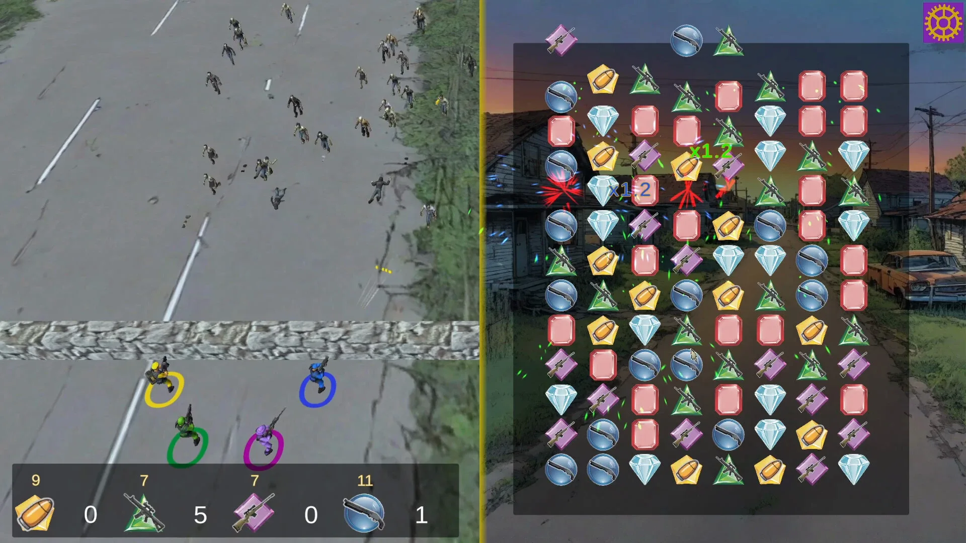 An intense blend of match-3 puzzle action and combat in Match Kill Survive. Your mission: survive relentless waves of zombies by matching tiles to generate ammunition for your squad. Each color you match powers up a specific squad member, allowing them to unleash devastating attacks on the undead.