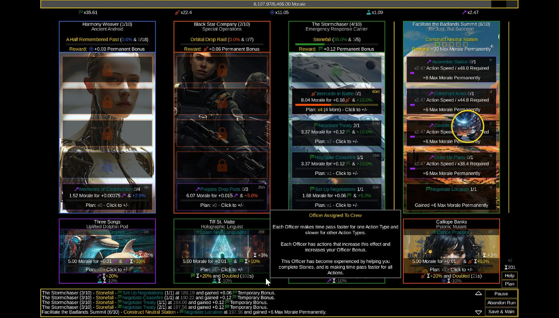 Idle Incremental game. Take Actions to complete Missions until your Morale falls so low that you experience a Mutiny. Re-spec and restart using the bonuses to Action Speed and Morale you have gained.