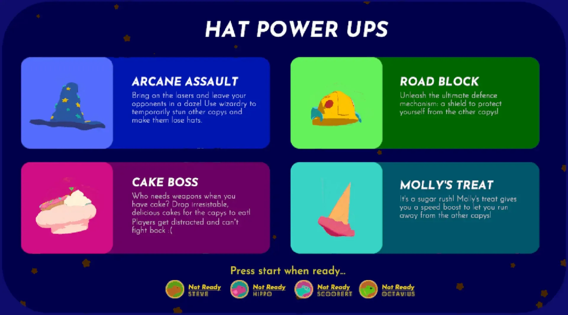 Capy Island is a party game where players, who are capybaras, play minigames on an island to collect hats. These hats will give them a step up in the final showdown where they will all battle it out. The capybara with the most hats wins!