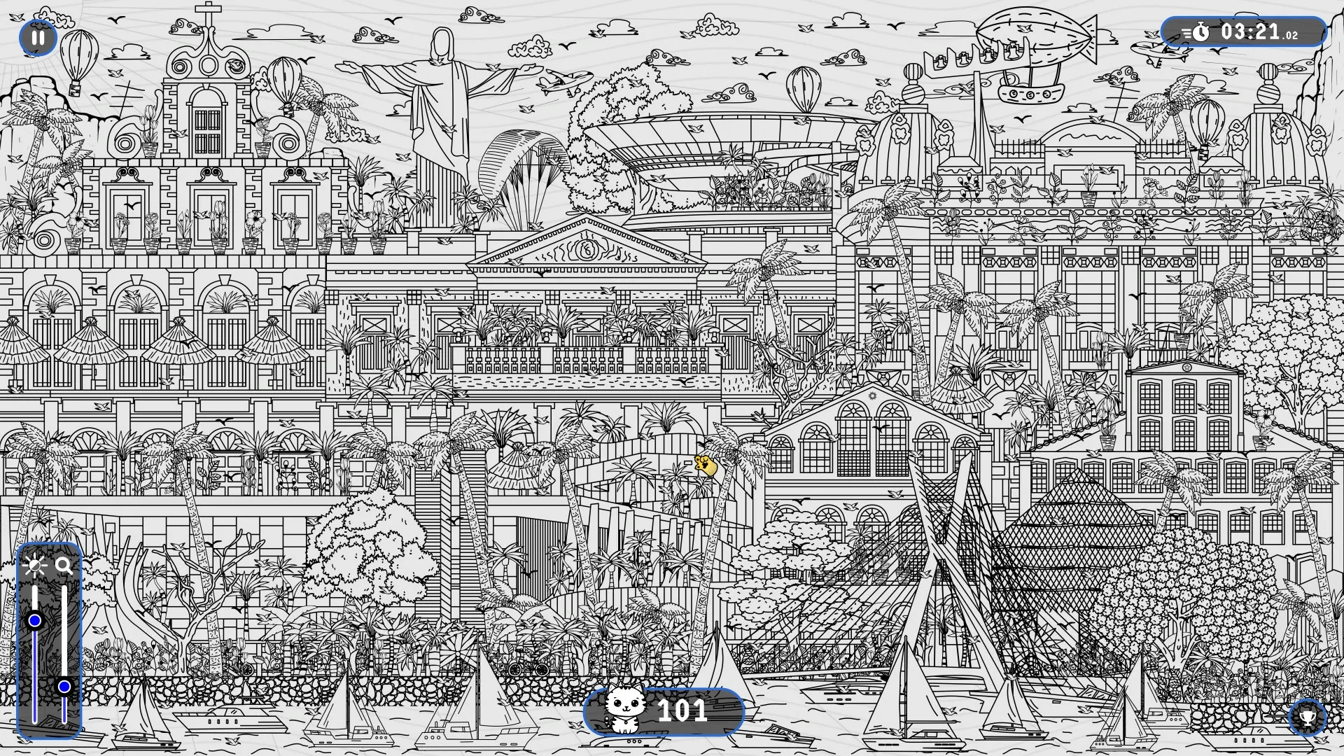 Find and discover 101 cute cats hidden throughout the Brazil landscape in this hand-drawn hidden object game. Can you find them all?
