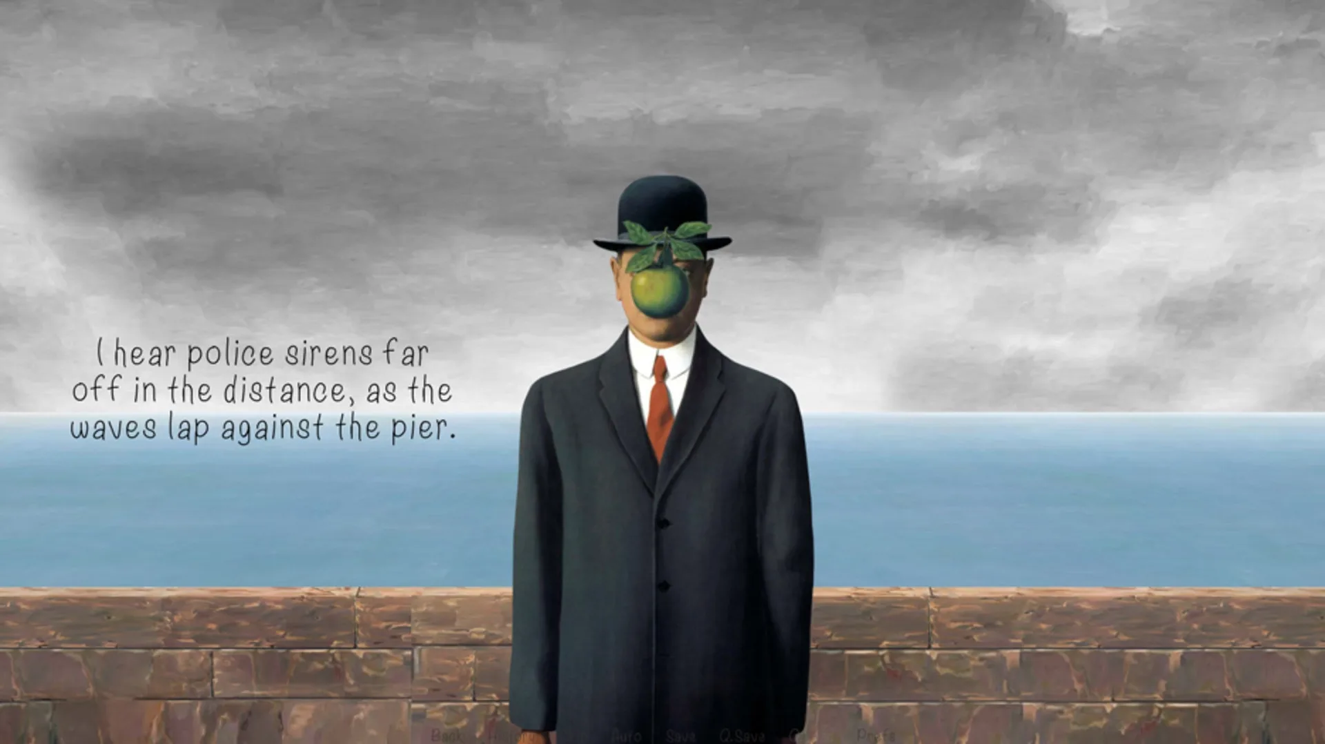 Made for the 02A2 Visual Novel Jam, this short, surreal visual novel is an exploration on the work of Rene Magritte, the allure of crime, and the nature of art.