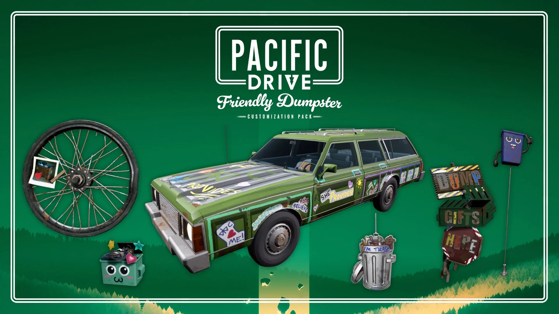 The Friendly Dumpster has always been there for you. Proudly display your gratitude by decorating your station wagon with a pack of in-game trash themed cosmetic items.