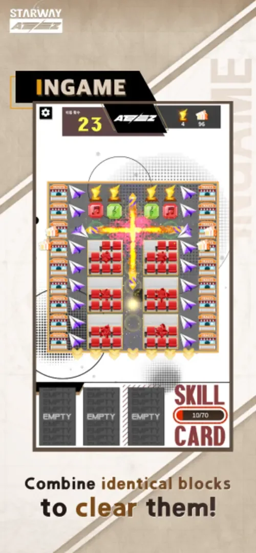 Starway Ateez is an Android puzzle game developed by Snowballs Inc. It's a simple and friendly game that everyone can enjoy. The game features match-three puzzles with Ateez . Players need to put three same blocks together to pop them. Matching four or more same blocks will create special blocks that can help clear the board faster.