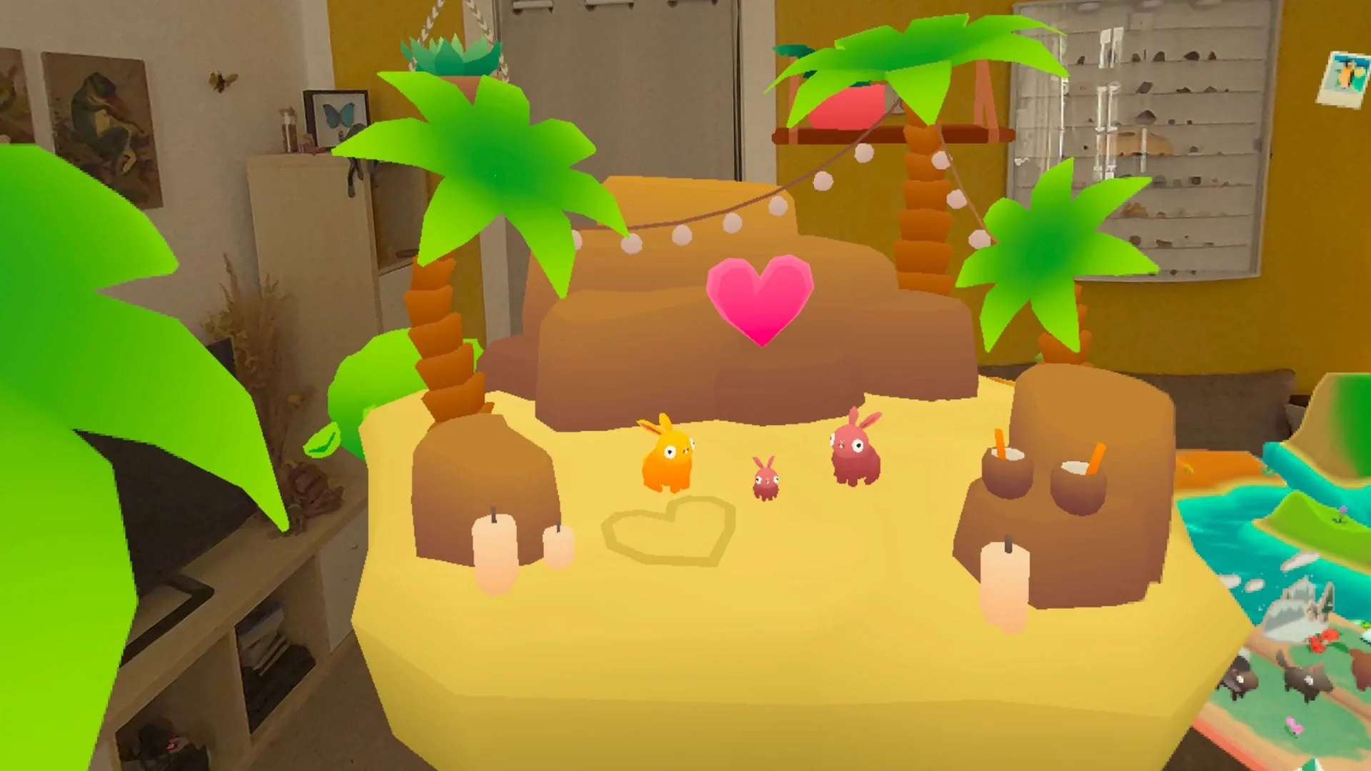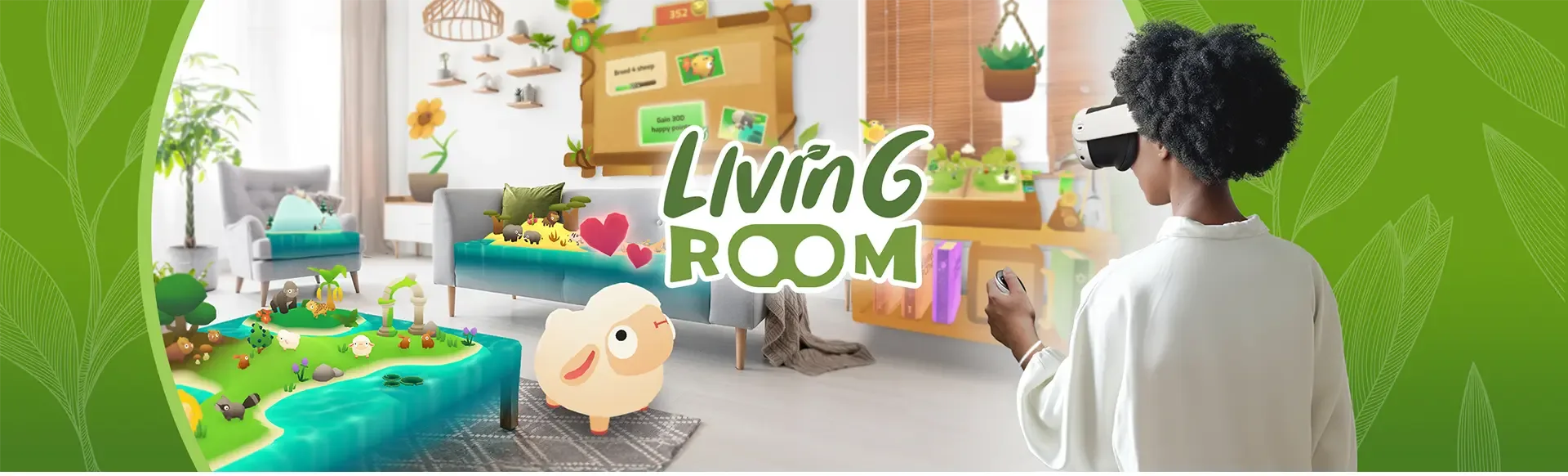 "Living Room" is a mixed reality eco-sim for the Meta Quest 3, in which you can nurture a charming, interactive ecosystem. Enjoy the simple pleasures of tending to plants, caring for adorably derpy animals, and watching your environment flourish. This cozy experience is perfect for relaxing, and unwinding, while also offering a somewhat chaotic and delightful escape into nature's beauty right inside your living room.