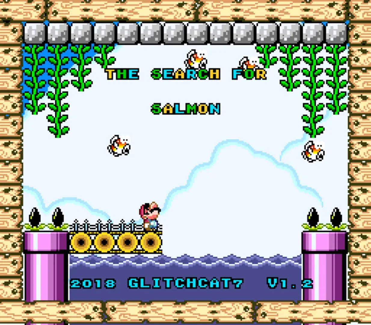 The Search for Salmon is an expert-level Kaizo. The aim of this hack isn't to troll or torture the player, but rather to provide an extremely difficult challenge in a fair and interesting way. Players will need to employ a wide range of Kaizo and Item Abuse skills. Shell, spring, and p-switch tricks are used alongside tight platforming and jump control. Beginners will likely be very frustrated, but seasoned players will hopefully find a fresh, fun challenge. There are however, a few Kaizo boxes (both marked and un-marked) and few tricks and traps along the way. The game also features optional coins to collect for "100%" runs, and some secret rooms and surprises to discover. There's even a checkpoint-save room so console players can rest without fear of losing any progress! Extensive play-testing has been done by myself and others to confirm that the entire game is indeed RTA-viable. I hope you enjoy it! Edit - Had to fix a few more potential music problems that would lead to crashes. Everything should be solid now.