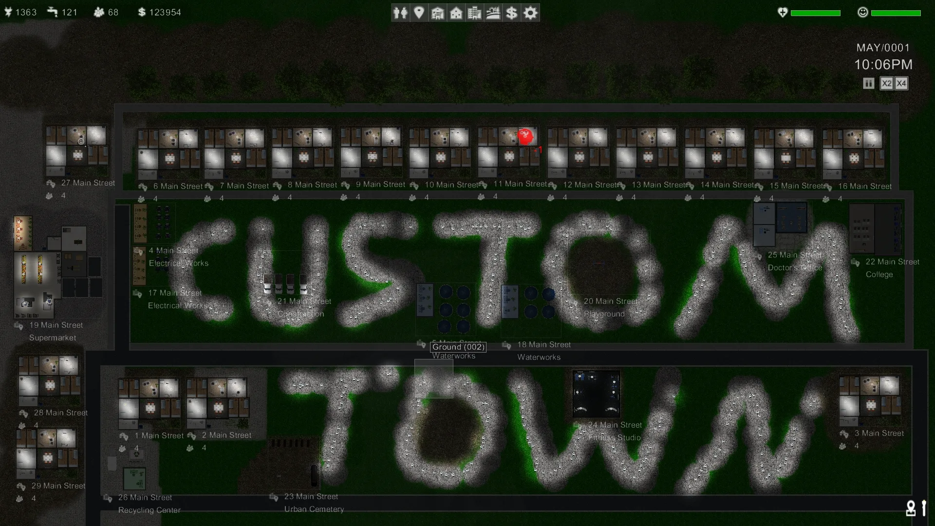 A Town Building Game that lets you design most elements from the ground up. Create your own addresses and houses and customize your own residents. Watch your intelligent and autonomious residents on their own daily schedule that you have planned.