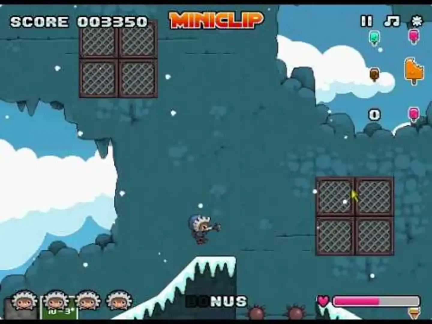 Frost Bite 2 is the sequel to Frost Bite. The player controls a climber who is trying to reach the top of several different mountains, this time with caves!