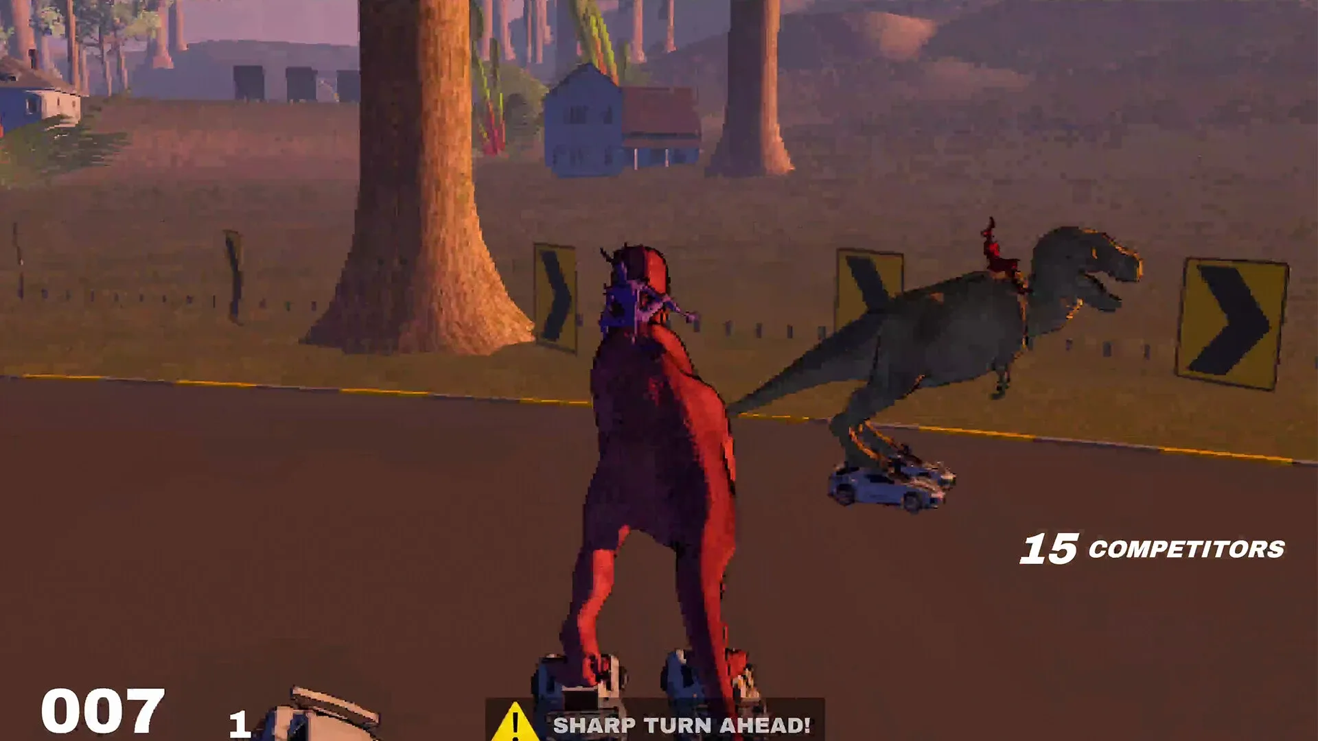 A racing game where you ride dinosaurs who skate with car-shoes.