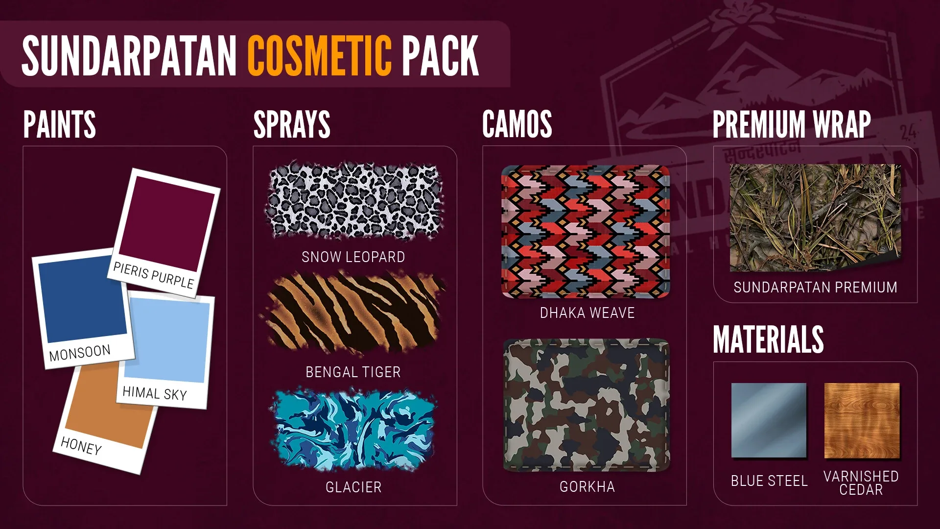Decorate your weapons, tents, and ground blinds with cosmetics inspired by Sundarpatan Nepal Hunting Reserve. The contents of this pack are cosmetic only.