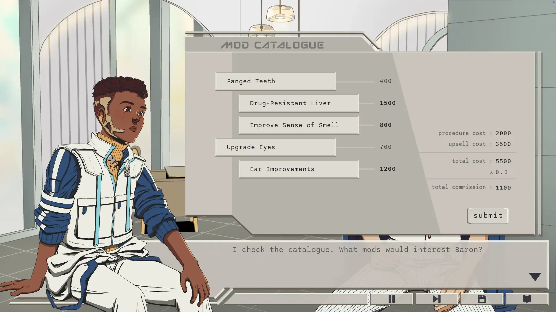 Work as a body modification consultant in a dystopian future. Talk to clients, make recommendations, and decide how much to upsell them. Your choices will impact each of their lives. Balance helping others with earning enough to save your sick rabbit.