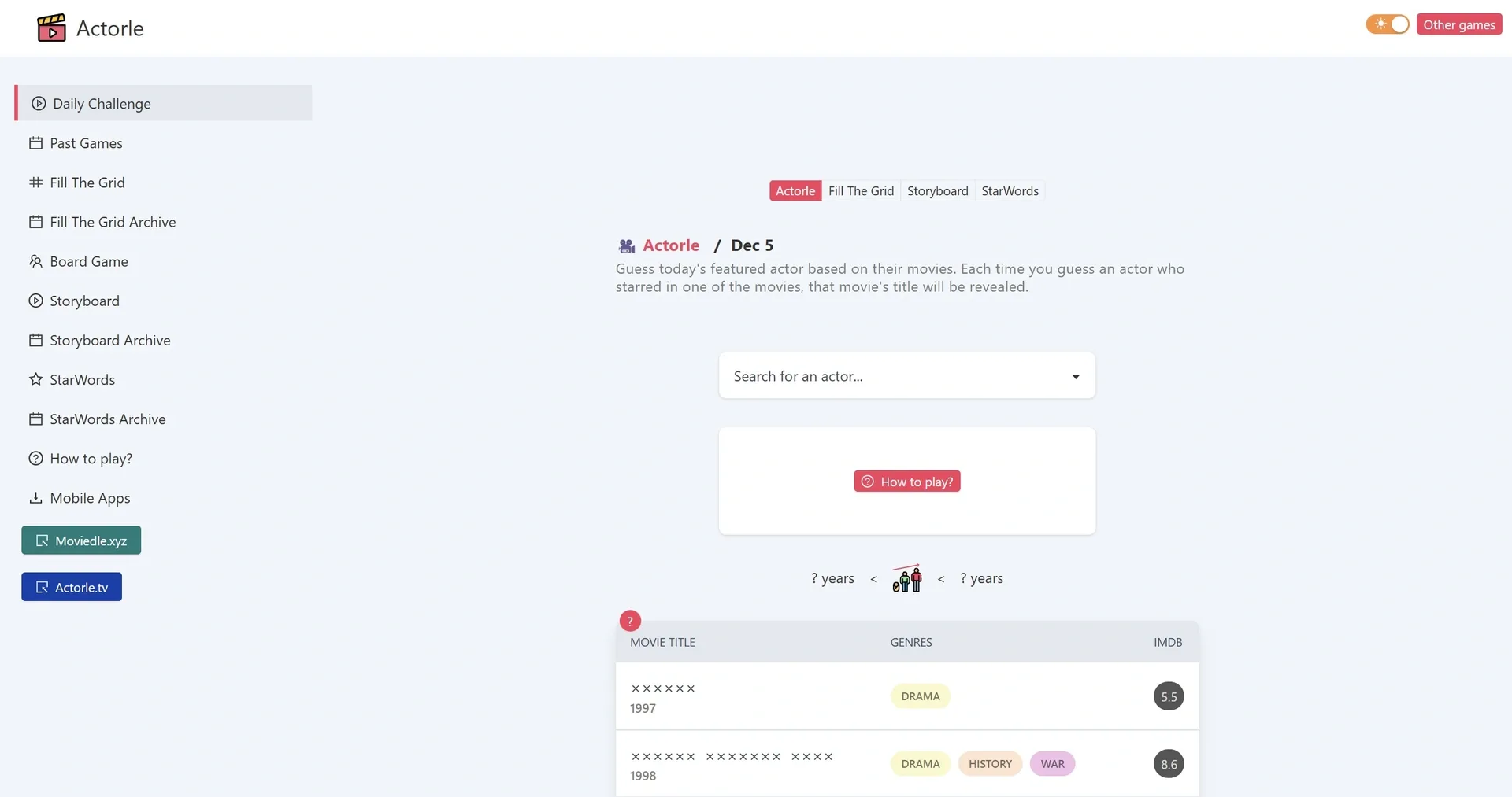 Guess today's featured actor based on their movies. Each time you guess an actor who starred in one of the movies, that movie's title will be revealed.