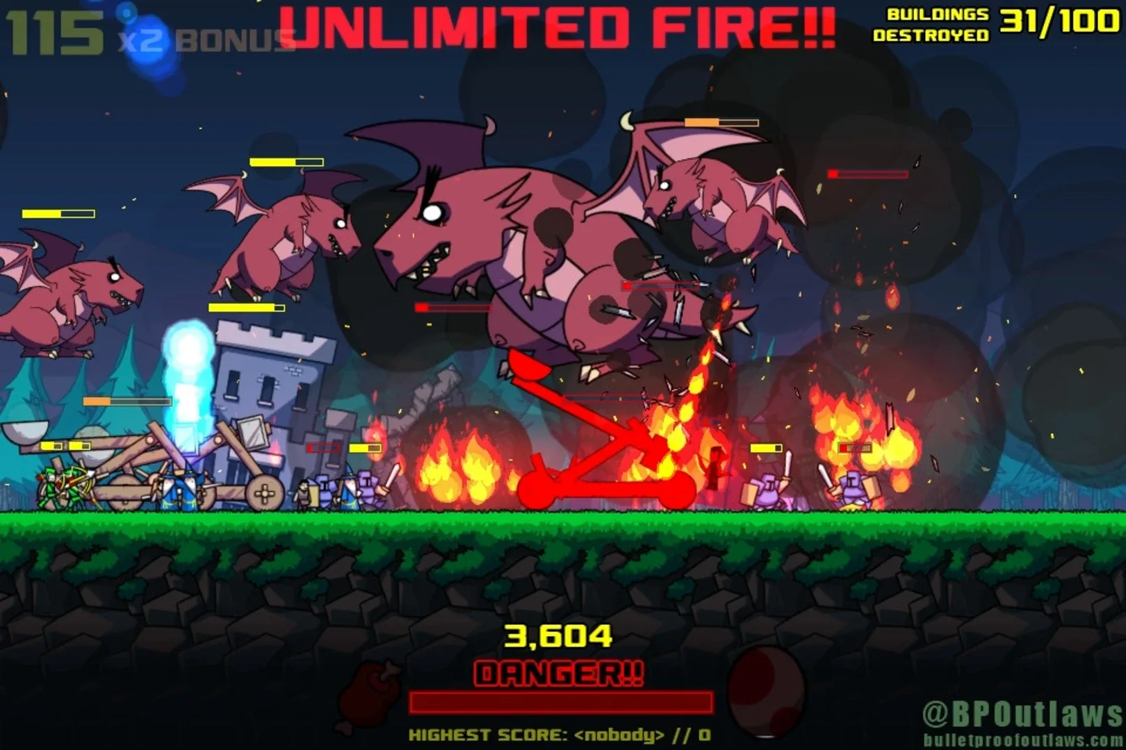 Fast-paced destruction! Tear the #!@$ out of a mountain-top village as the King sends out his royal army to try to stop you and protect his kingdom. The more villagers you devour, the stronger you get. Fill your belly and enter Rampage Mode where you can unleash mass destruction!