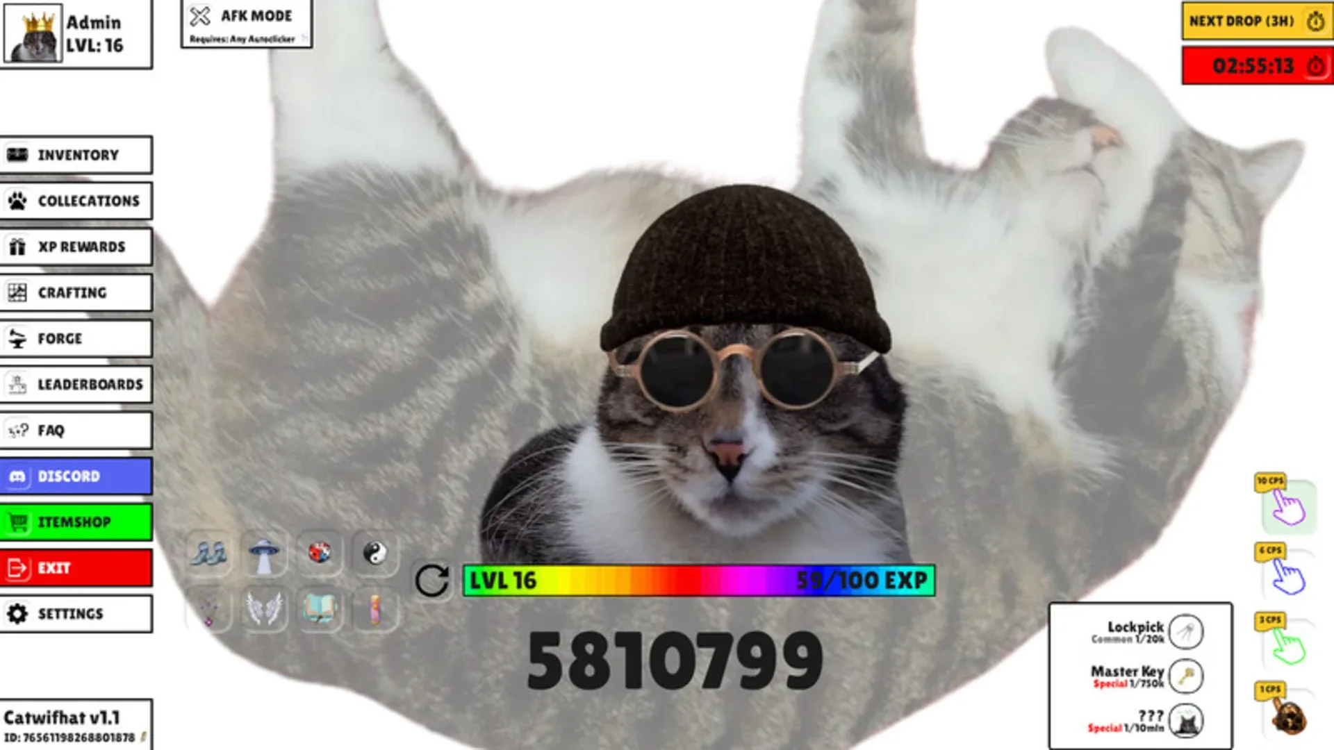 Catwifhat is the first Steam idle clicker where clicking directly drops tradable skins and items. Cats determine your drop pool — collect, craft, level up, and play actively or AFK.