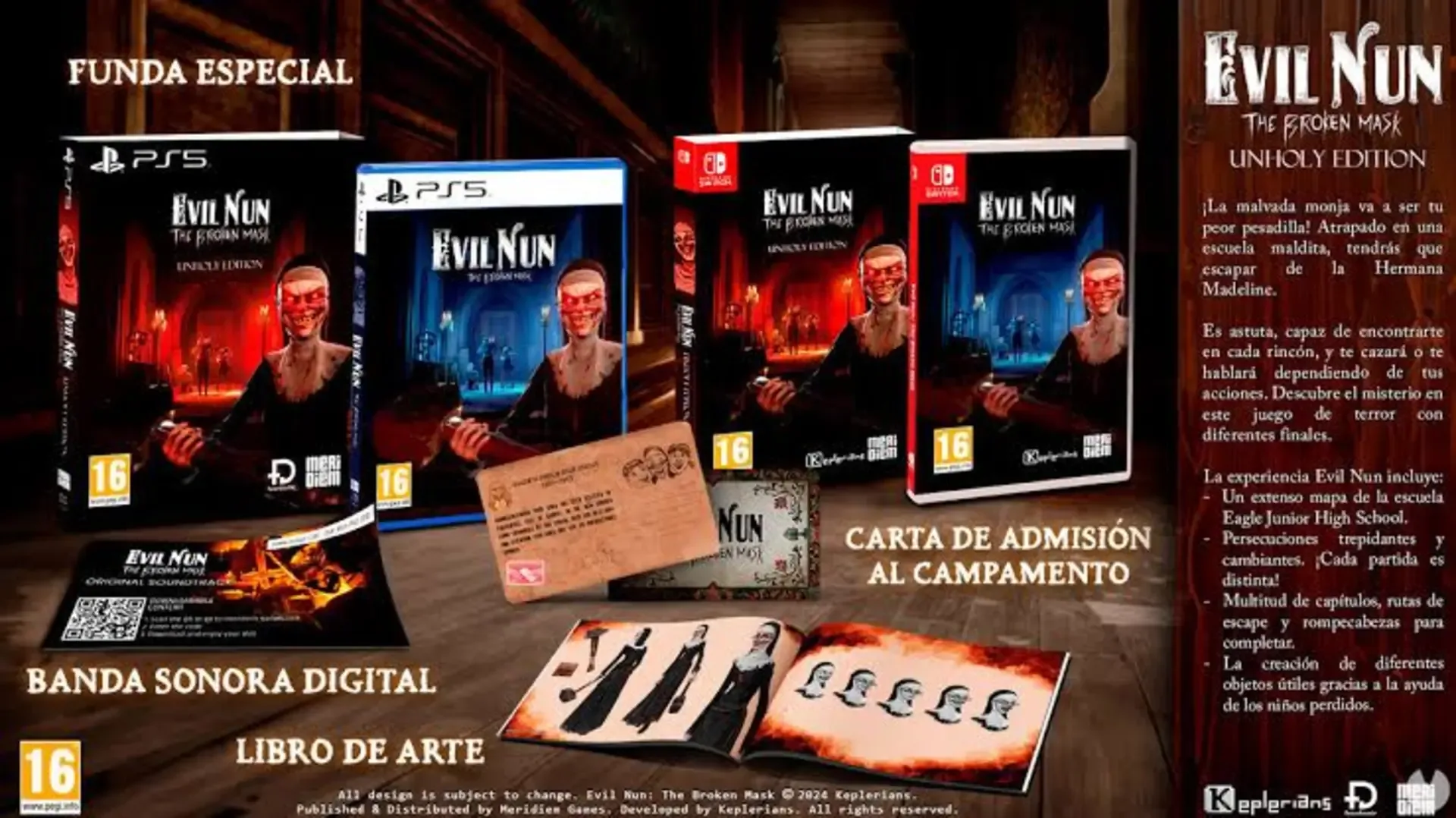 Evil Nun: The Broken Mask – Unholy Edition is a first-person horror game where players try to escape a haunted school while avoiding Sister Madeline, an AI-driven enemy who reacts to the player’s actions. The gameplay involves solving puzzles, crafting items, and exploring different escape paths. It’s based on the original mobile game series and includes updated graphics, new areas, and an expanded story. The Unholy Edition includes a slipcover, digital soundtrack, camp admission letter, art book, and the game disc.
