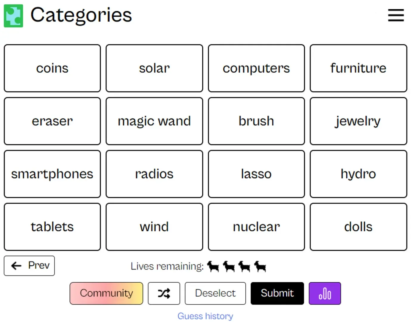 Discover the challenge of "Categories", a word association game that tests your ability to find links between seemingly unrelated words. In each round, you are presented with a grid of 16 words and your task is to form four groups of four connected words. Each group must share a unique link, be it a common theme, category, or relationship. As you explore possible categories, keep in mind that the game allows for only four mistakes before ending. Play alone or compete with friends to see who can master the art of making categories!