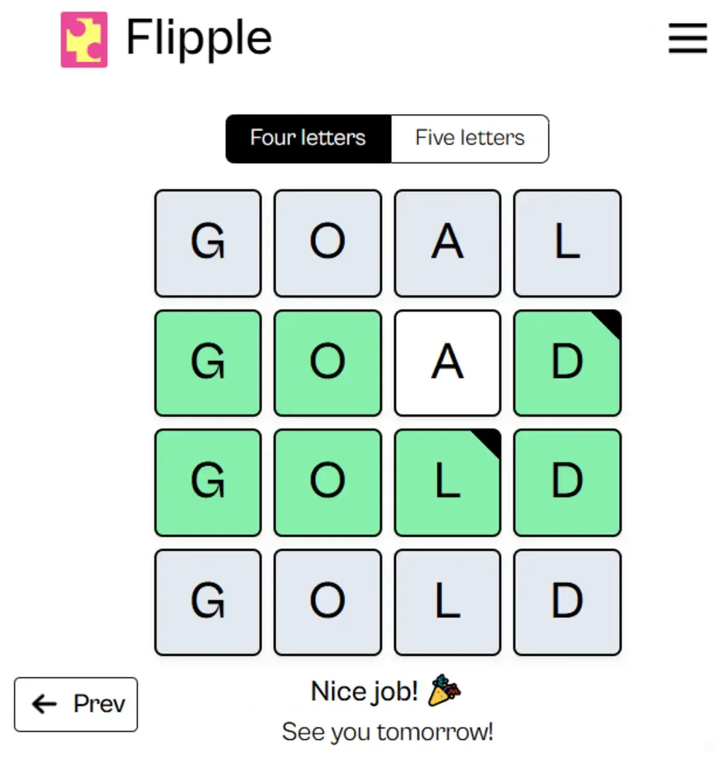 Flipple is a word transformation game that challenges your vocabulary and problem-solving skills! In Flipple, you start with a given word and aim to transform it into a target word by changing one letter at a time. Each change must result in a valid word, making each move a test of your word knowledge and strategic thinking.