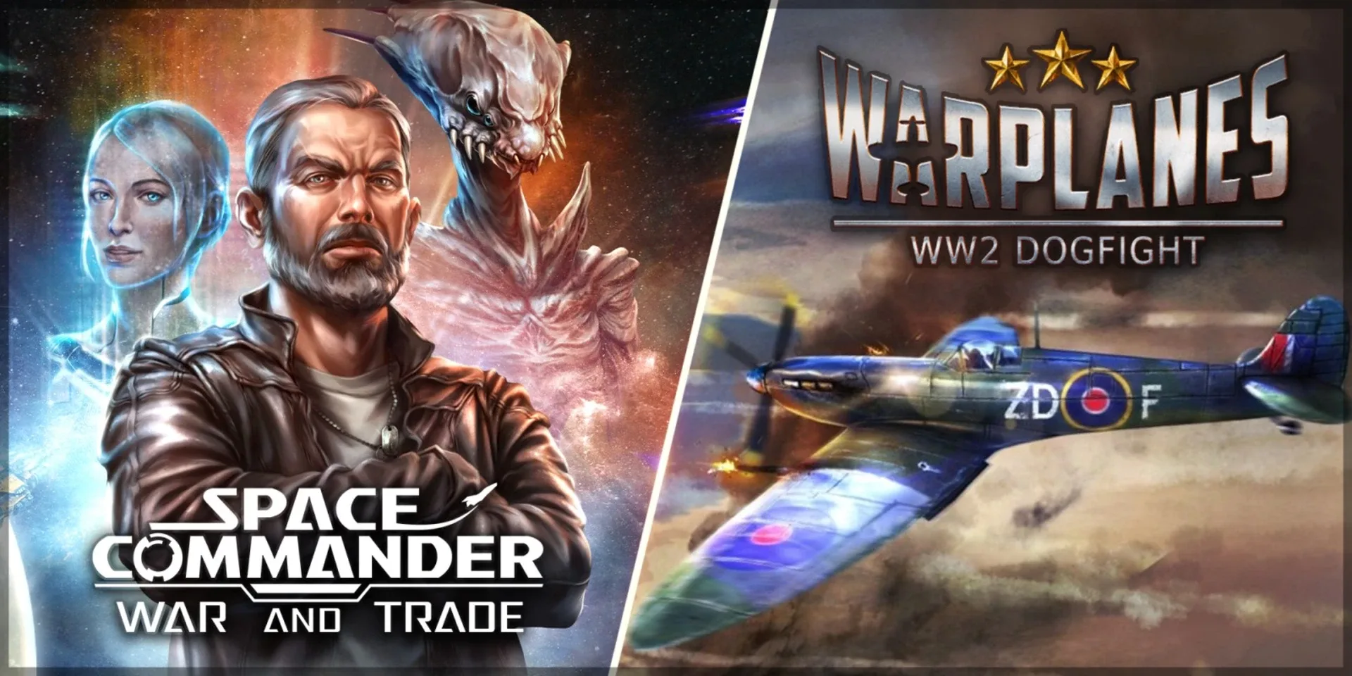Become a legend of air combat! Two thrilling flight combat games together - Warplanes: WW2 Dogfight and Space Commander: War and Trade.