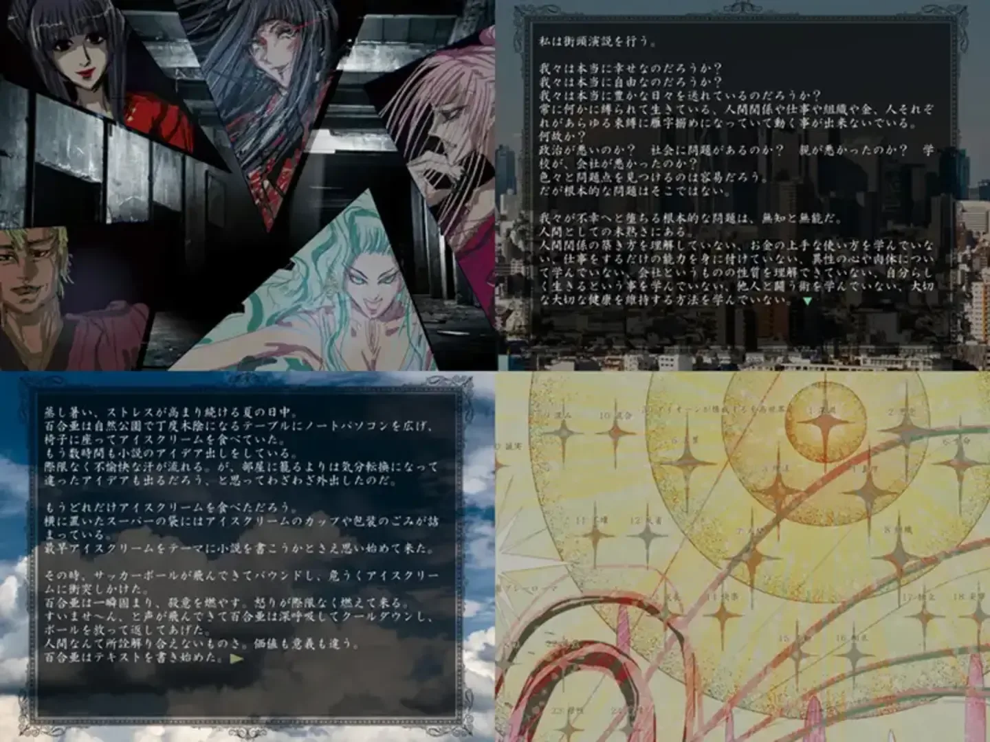 A visual, sound, and novel game that illustrates a Gnostic world. A story that combines human history, religion, politics, fiction, and prophecies.