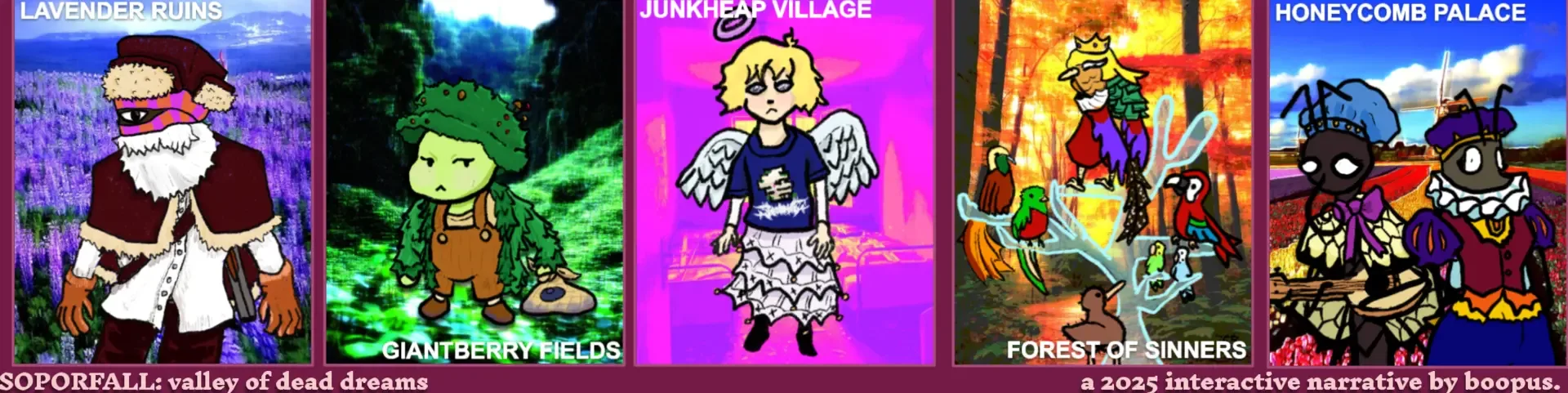 A collection of five interactive narratives exploring a variety of dreamscapes which, interwoven, tell the story of a shattering dreamer. Befriend fallen angels, spelunk impossible ruins, find love amidst regal bugs, get in poetry battles with forest critters or delve into a pastry-making bureaucracy. Soporfall valley is yours!