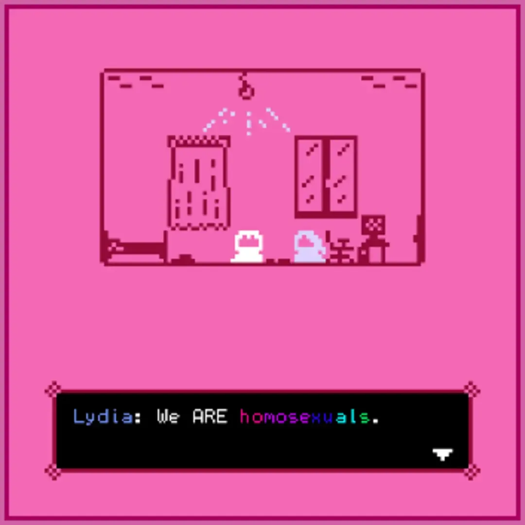 This game tells the story of Lydia and Ophelia - two lesbians who experience their first date in person, after they have been talking online for a while. The scene takes place in Ophelia's place, after having had a date on a café in i am feeling things.