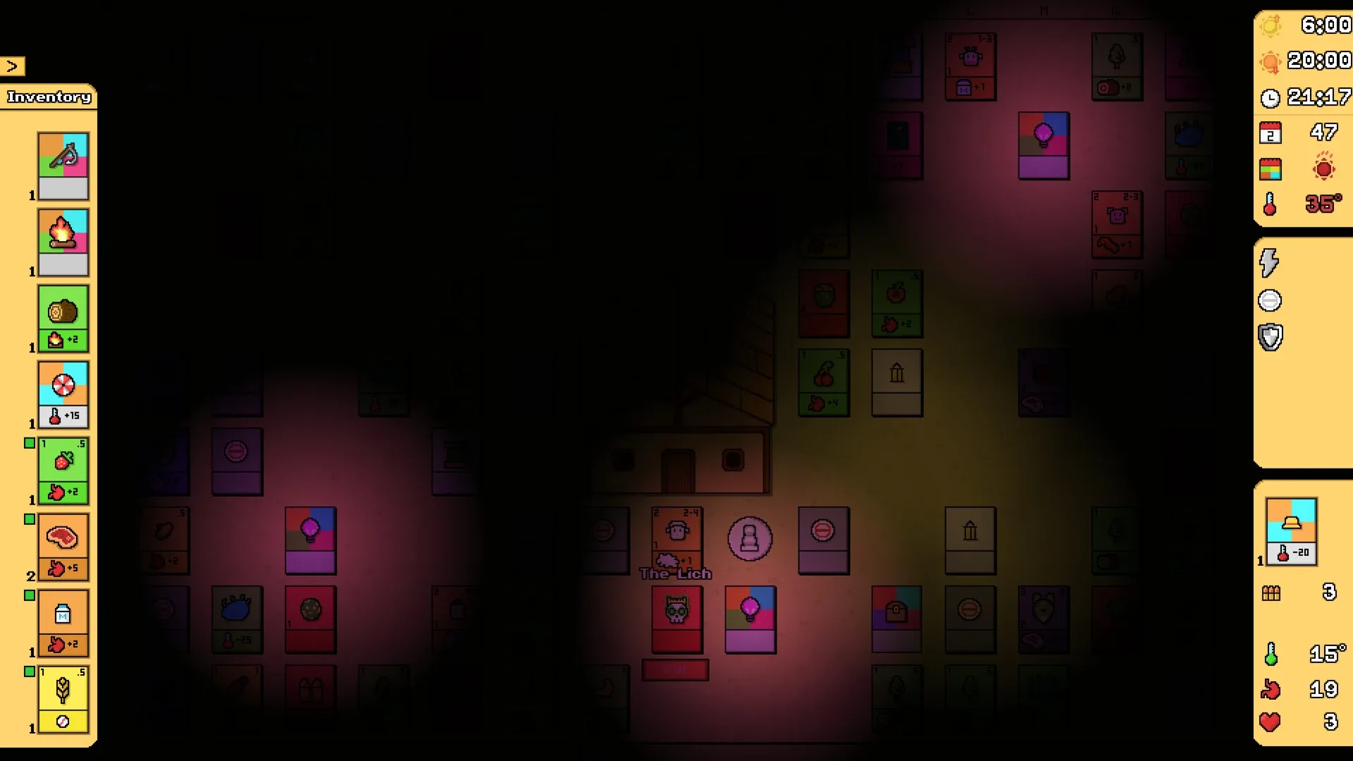 "Necropolis Nights" is a survival card game where you gather resources, craft, farm, and hunt by day, then fend off zombies at night. Strategize to survive and thrive in a world overrun by the undead.