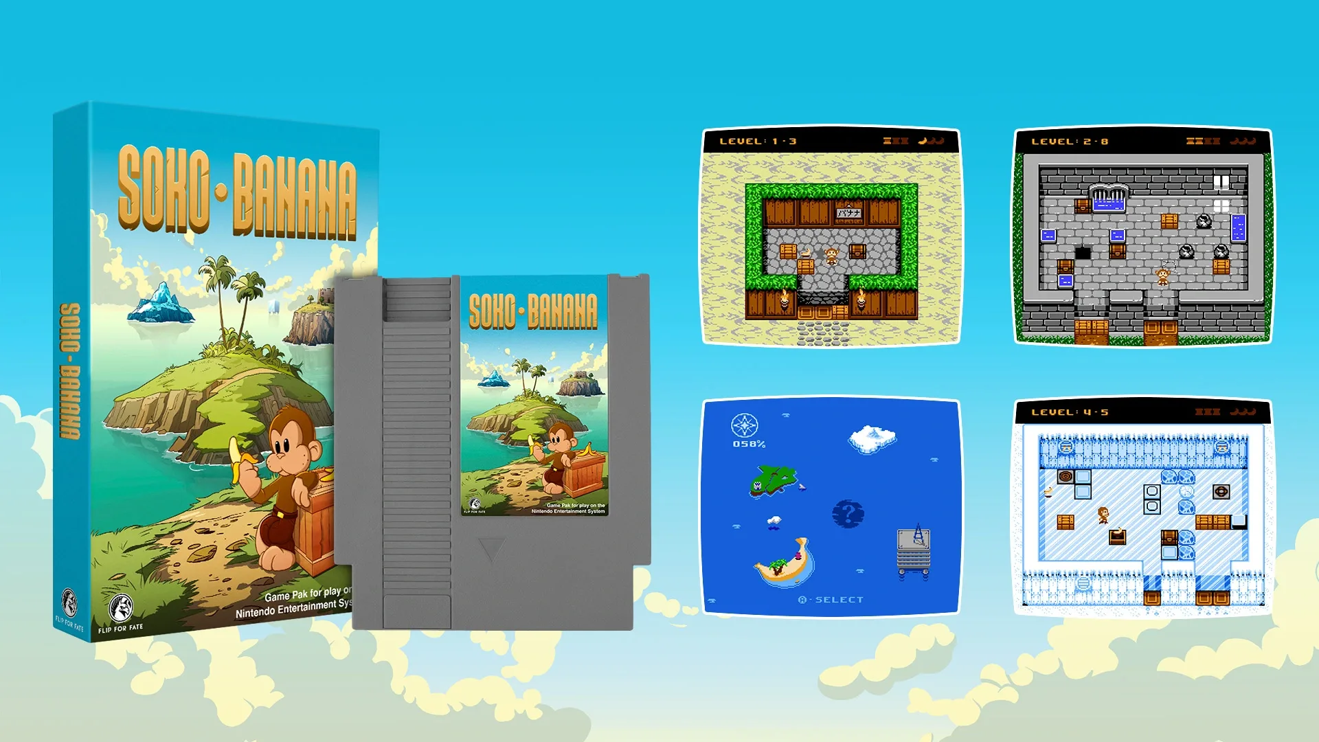 "Soko Banana" is a puzzle game developed for the Nintendo Entertainment System (NES), inspired by the classic Sokoban concept. Players guide the young monkey, Skid, through banana warehouses across five distinct islands, each introducing unique mechanics such as pits, breakable blocks, and teleporters. The objective is to maneuver banana crates to designated exits while collecting bananas to unlock bonus levels. The game offers 55 levels in total, including hidden secrets.