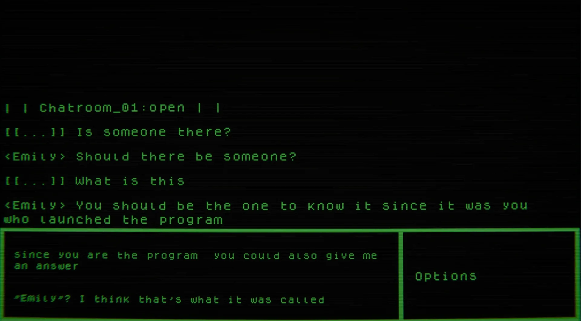 Chat with a mysterious AI, uncover secret codes and find hidden files. Your choices may lead you to uncover different things, the only way to find the truth is through Emily and whatever was left inside the old computer. You need her help