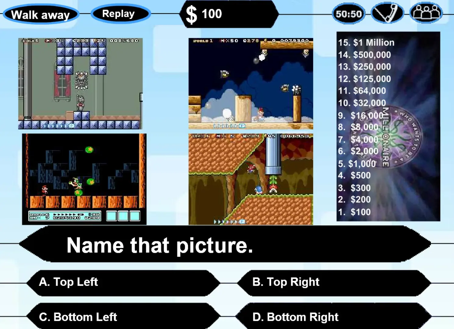 Welcome to the Video Game Trivia Challenge. Here, you will answer over 75 questions and identify over 50 songs to gather (fake) money. Earn enough to receive passwords. The game is based on Who wants to be a Millionaire, and most pictures and sounds are from that show. Other songs are from various video games. Good luck, and have fun.