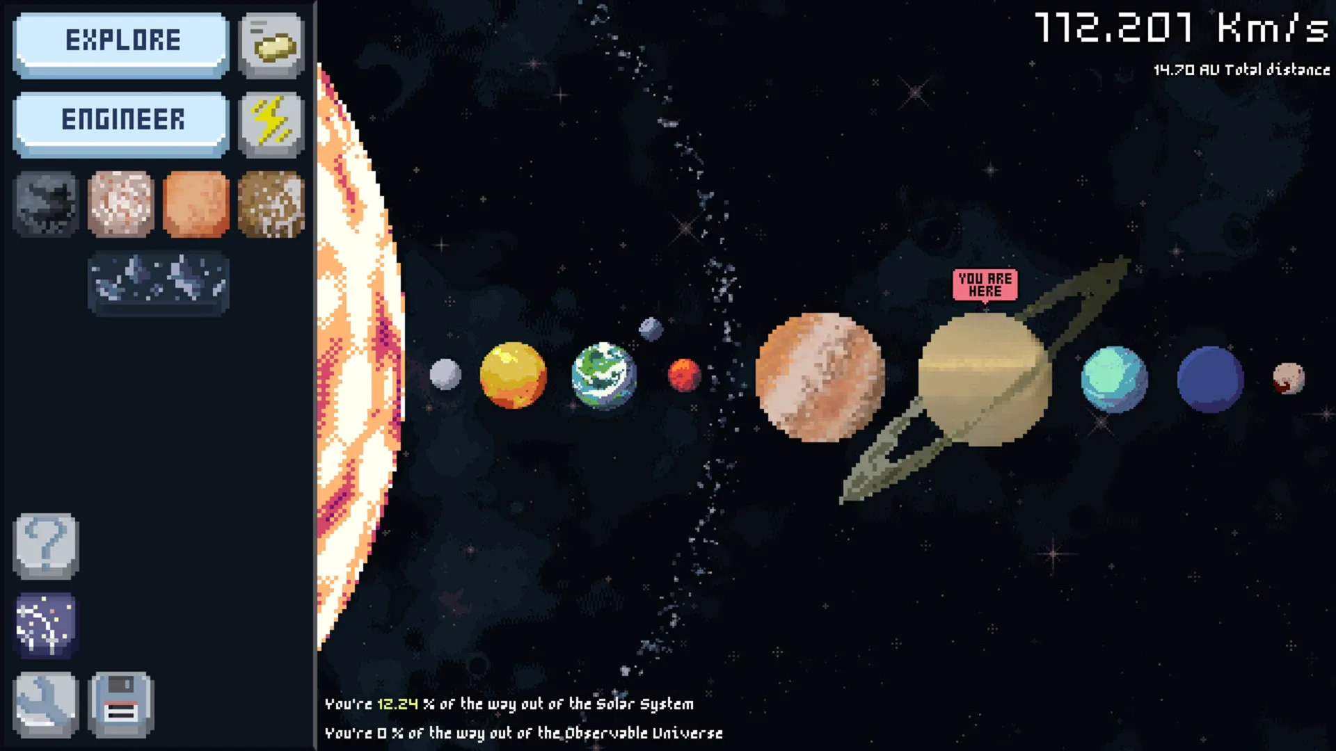 An idle incremental game where you decide to travel across the whole Universe. Embark on this journey in your little ship and get as far away as possible from Earth, gathering resources and upgrading your spaceship along the way.