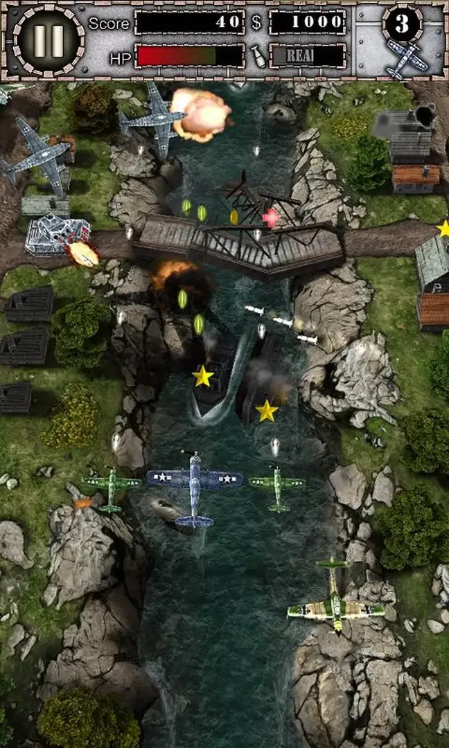 AirAttack is an action video game played from top-down perspective and three-dimensional environment. At the beginning of the game, the player starts with three planes, resembling the F4U Corsair, P-38 Lightning and a Yakolev Yak-3. They must choose one from the three and start their fight. The latter planes also use flamethrower and fireball. A flamethrower is used to burn all types of enemies, while the fireball serves the plane as deflection from crashing into another planes with swift pivotal circulation. The player's plane has a primary weapon that fires continuously at a constant velocity that can attack aerial enemies, land enemies except the train, and certain buildings. The plane is manipulated by moving it along screen, possibly using mouse, tilting the device, joypad and relative touch (manual input sensitivity). Double tapping the screen drops a bomb that can destroy land enemies and buildings in order to collect coins. Shop also appears throughout the level. Player can enter it to buy gadgets such as homing rockets, super rockets, turrets, shields, side planes, lightnings, bombs that can destroy wider area, extra lives, cannons, and timewraps (provides slow motion technique). AirAttack departs from the traditional 2D platform of vertical shoot-em-ups and opts for a fully realistic 3D world", creating a point of difference from other similar games of this nature.