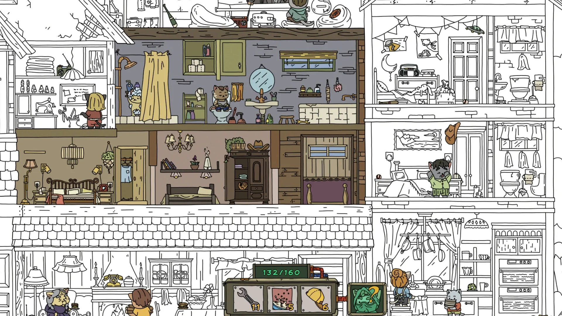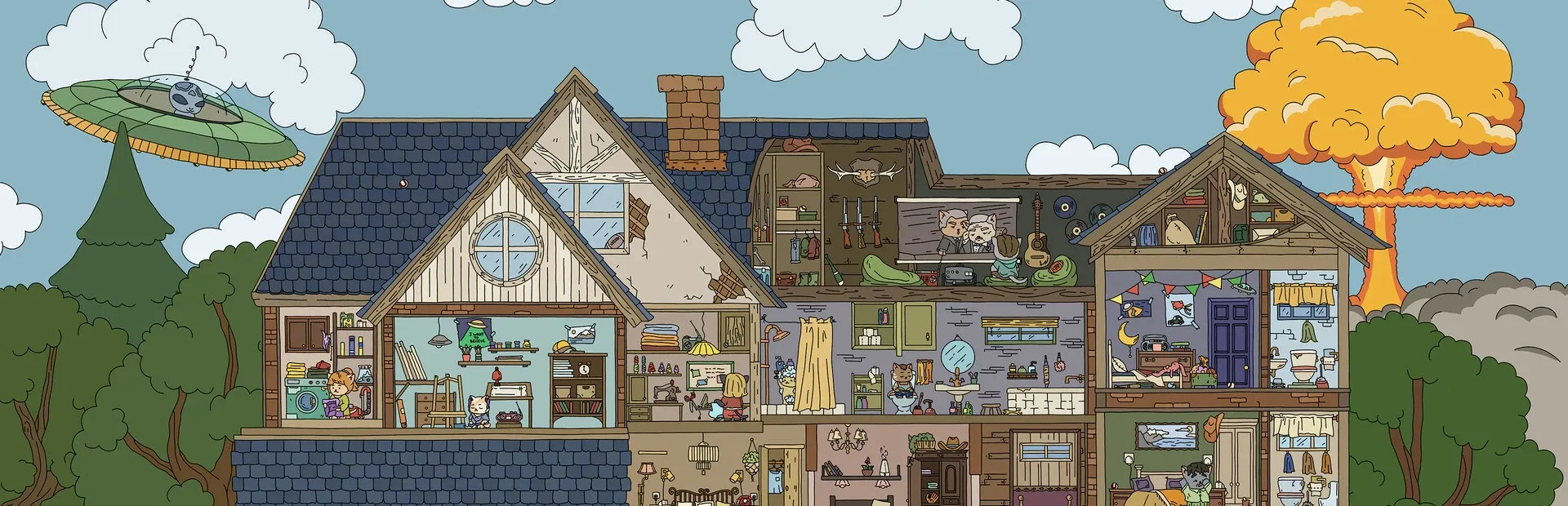 Explore the underground bunker and the surface of the earth in anticipation of a nuclear explosion, finding various items and painting the black and white picture with colored inks.
