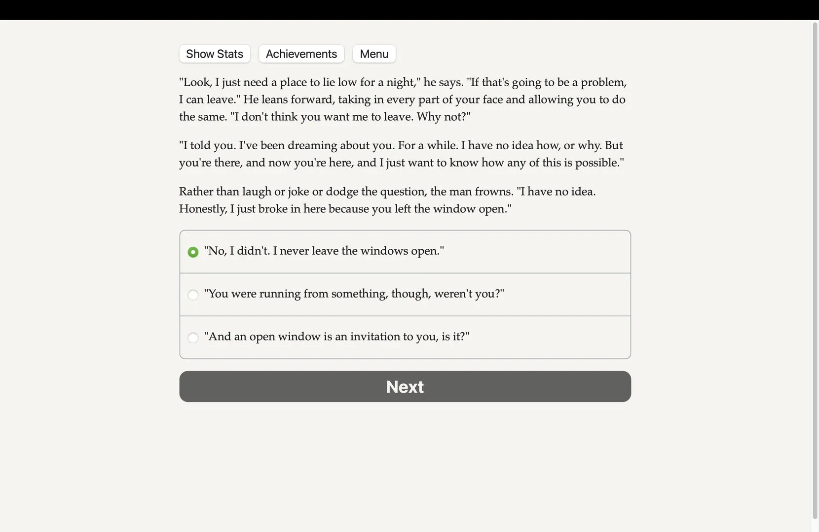 Meet the enigmatic stranger who's been haunting your dreams and embark on a supernatural adventure of twists and turns, love and heartbreak, and foxes. A text-based interactive supernatural romance, 300,000 words and hundreds of choices, without graphics or sound effects.