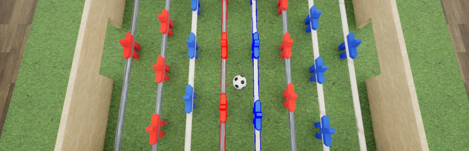A two-player game on a single computer, where both players control rods to kick the ball into the opponent's goal and score points. This game also features an impostor control mechanic.