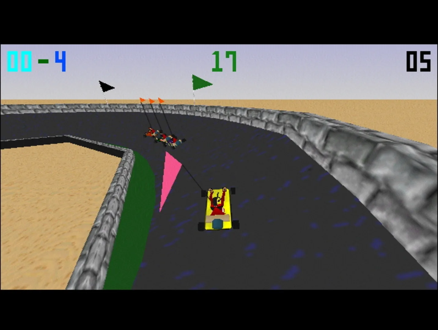 HotCarts is a 1-player go-kart racing game for Macintosh. The player races against three other opponents on a track. Split screen allows for 2-player games. There is a track editing program for creating custom tracks.