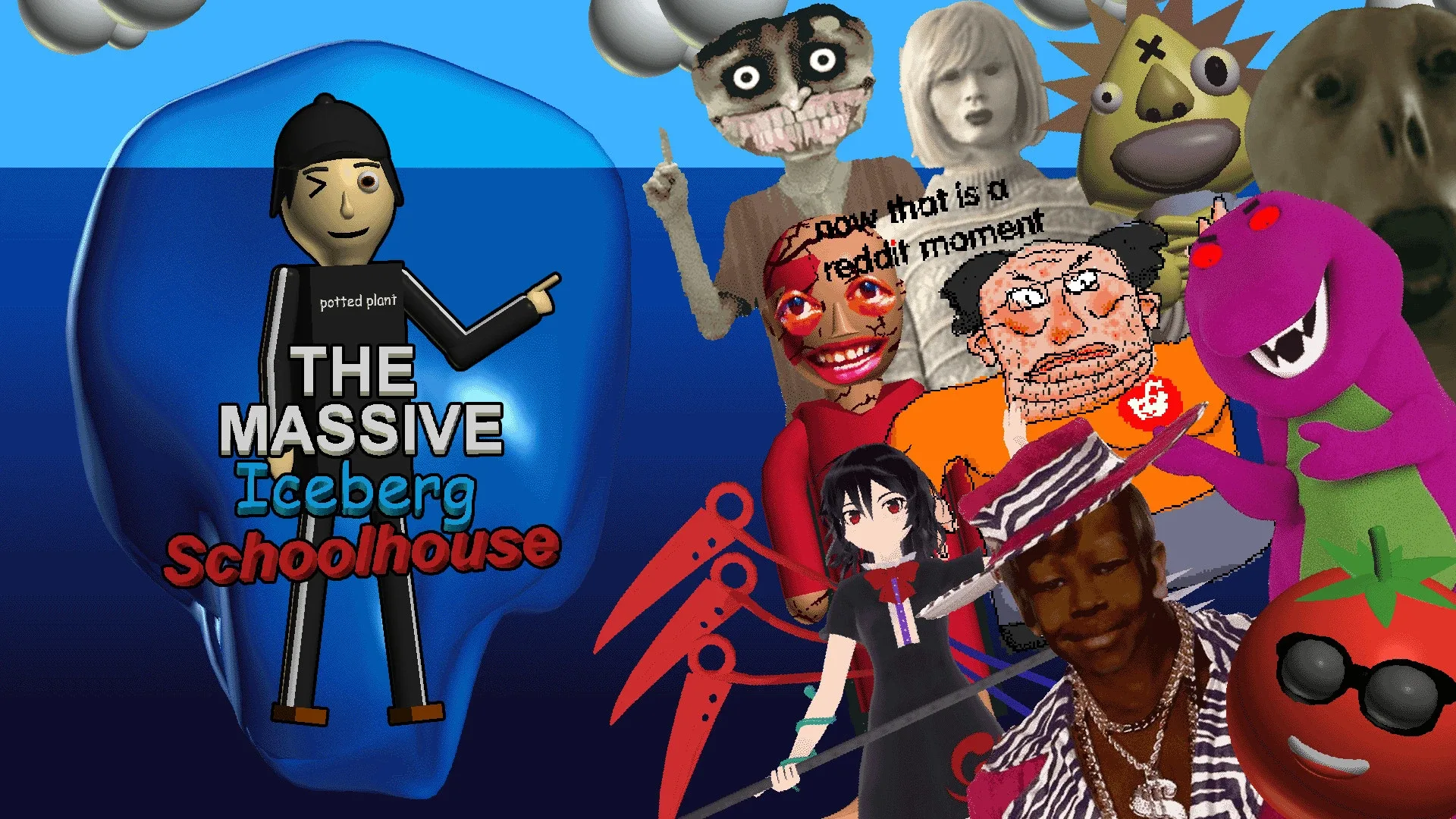 While you were on YouTube, you found a series by Sweguin called Massive YouTube Iceberg Explained where he explains every entry on the Massive YouTube Iceberg (obviously), and it apparently has 1000+ entries. Not only you absolutely loved the series, you wanted to look at more massive iceberg charts like the one in that series. Eventually, you heard that the iceberg's creator, Potted Plant, is making an internet iceberg with 5000+ entries. So just like any sensible person would, you developed a parasocial relationship with him and constantly DMed him on Discord to see the internet iceberg. A few days later, Potted Plant told you that he just opened a schoolhouse in Thailand where there's not just one, but TEN iceberg charts you can get there, so you immediately booked a ticket to Thailand and travelled to his epic schoolhouse to collect all iceberg charts he made. However, there's a little catch! Potted Plant set it up so you have to answer questions about iceberg charts before retrieving them, and answering incorrectly isn't exactly the best idea in a Thai school. Not only that, he's also brought his whole gang (most of it somehow being entries from his YouTube iceberg) to stop you from collecting all of his icebergs so easily, so you must be careful! You could either get all 10 of the iceberg charts and exit the school, or you could dive deeper into the iceberg schoolhouse and research some of its interesting anomalies...
