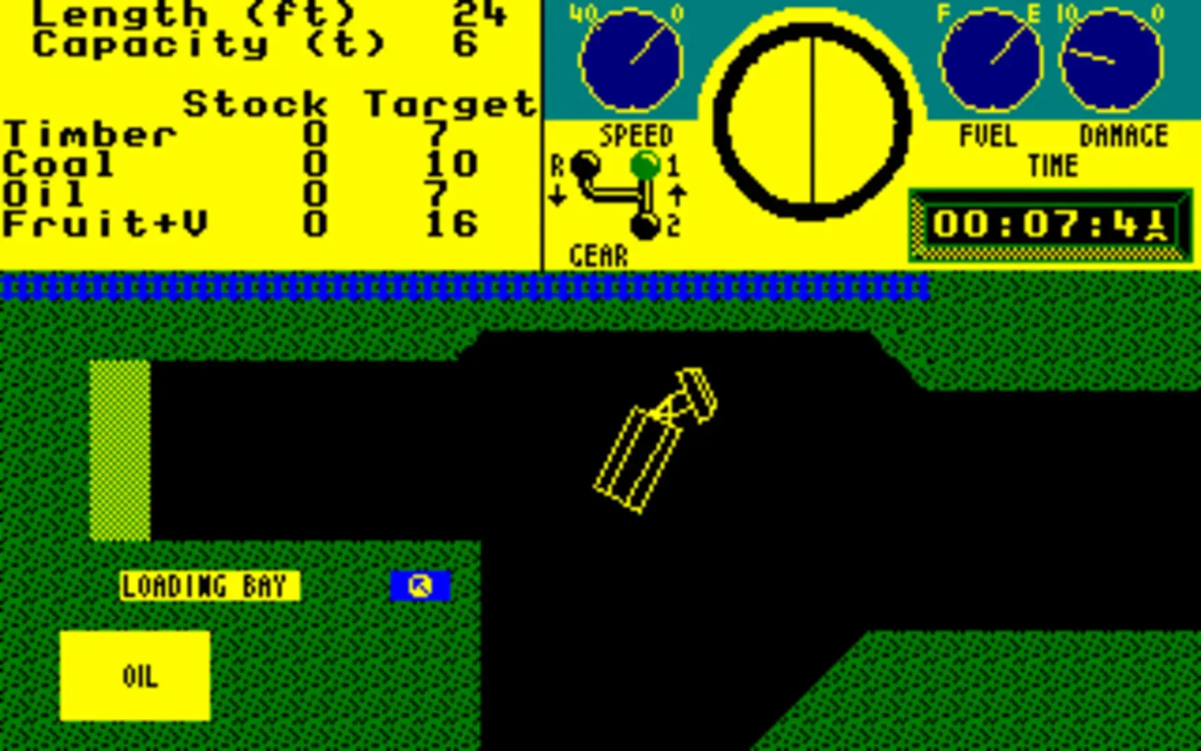 An early truck simulation game from Pete Cooke, a developer that later had more success with Tau Ceti and Tower of Babel. In this you have to drive a truck through a maze-style "world" and find the target of your cargo. Then you have to park your truck reverse in a parking bay to reload and refuel it. The game is made with vector graphics.