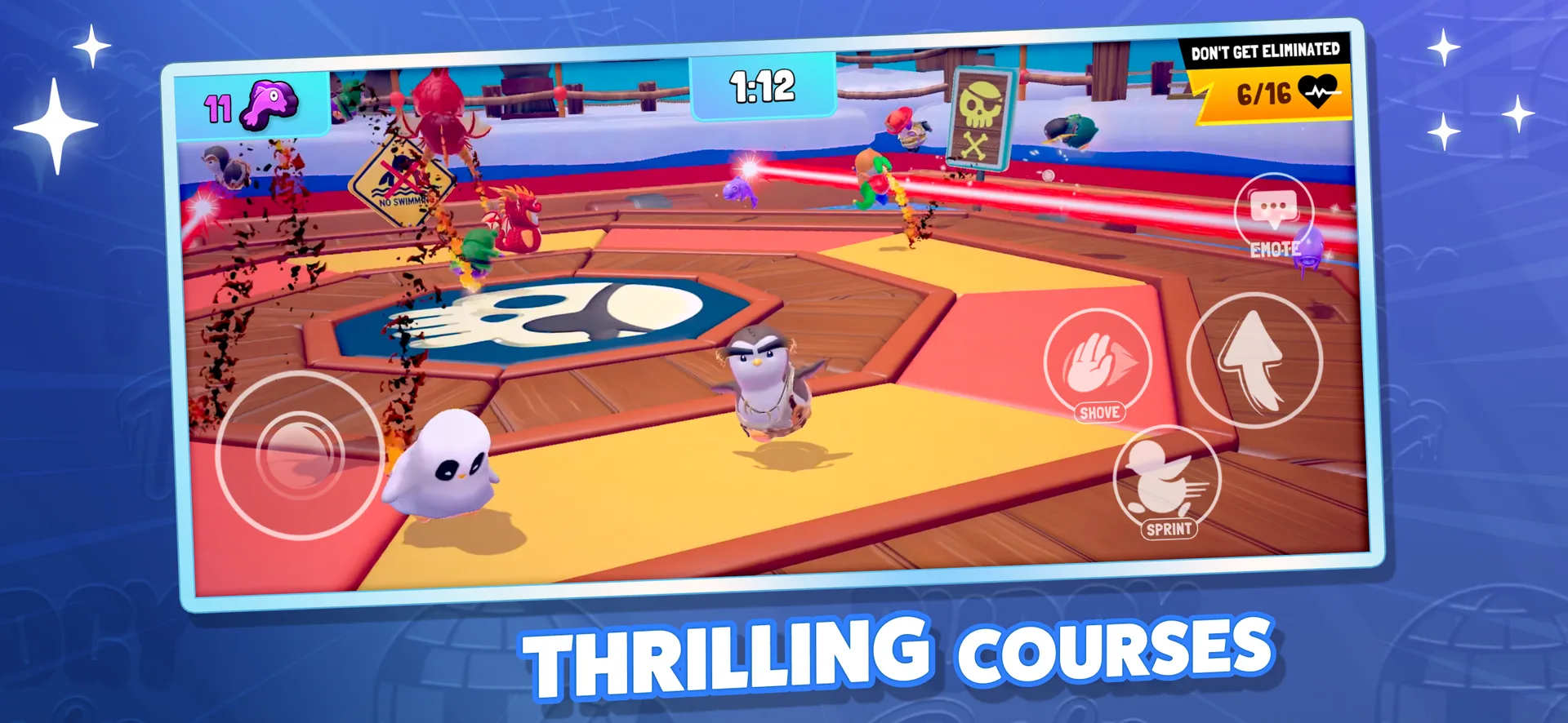 Stumble, survive, and race through a winter wonderland packed with wacky obstacles, fast-paced survival rounds, and high-energy races! Dodge spinning hammers, jump across slippery platforms, and outmaneuver rivals in a battle to be the last penguin standing. With up to 16 players in every match, every round is a fresh, chaotic rush to the finish line!