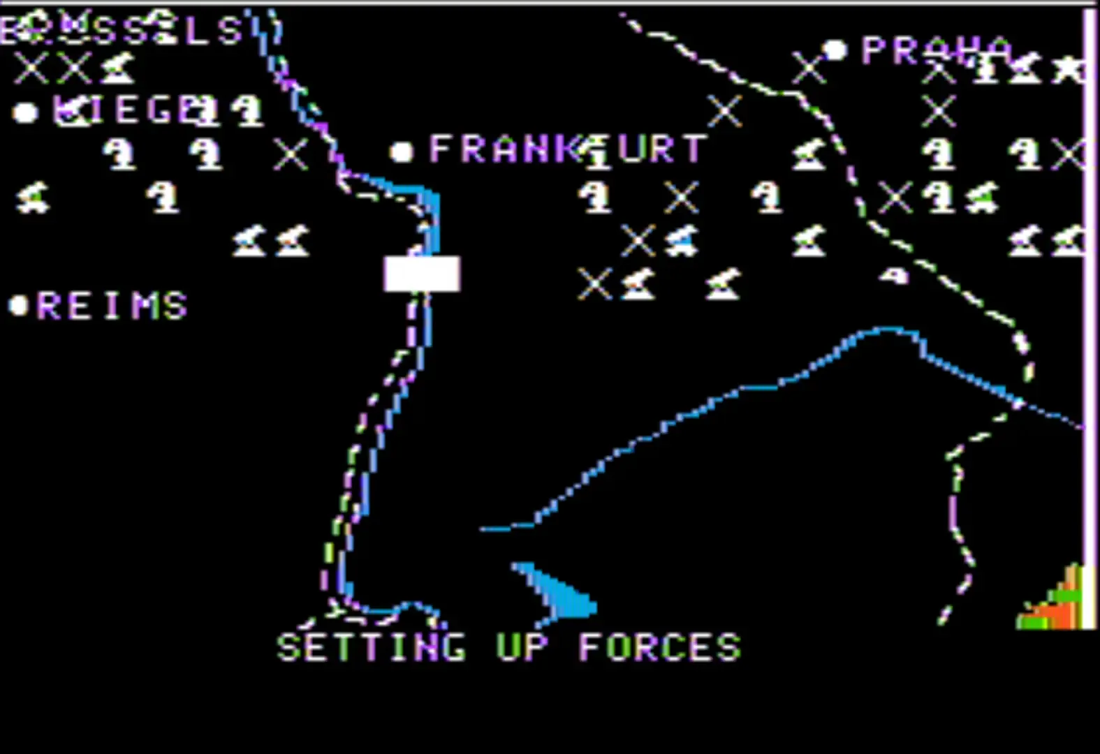 Waterloo II is a 2-player historical strategy wargame. Character movement and commands are placed via text, and each player takes turns inputting 5 commands for their forces, followed by their opponent. Each set of commands causes 6 hours of gameplay to pass. Weather, terrain, and time of day affects troop movement. The player controls infantry, cavalry, artillery, supply trains, and other troop movements. Troops must regularly rest, and night-time movement saps fighting men's strength. Each force is controlled by a general, and if they are lost, that team's troops leave the field. The ultimate goal of French forces is to capture Brussels, which would force Prussian and Russian forces into retreat or capture and hold Calais, which would send the British into retreat. British forces will attempt to gain Paris, which puts Russian and Prussian forces on the field, or kill Napoleon, causing a rout of French forces. The battle continues until one side has lost all troops.