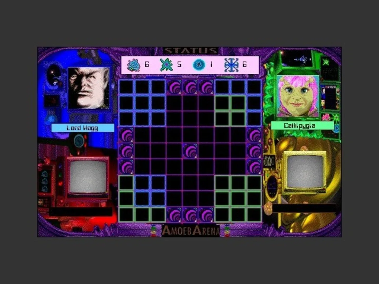 "Start with a futuristic version of Chinese checkers invented in a biohazard lab, add just a dash of the cantina scene from Star Wars, and you’ll get a pretty good idea of what AmoebArena is all about. This strategy" game’s concept is simple: pit your army of microscopic organisms against your opponents’ microscopic armies in a free-for-all arena battle. Imagine the game of Risk invented by a mad cellular biologist Your armies are made up of four types of single-cell soldiers: cytozoids, amoeboids, mitoplasts, and blockers. Each type varies in terms of movement, attack power, health, and ability to reproduce. You start the game with a set number of each organism, which you place in your corner, or “home area,” of the board. Your opponents do the same, and then it's a cytoplasmic slugfest as you pilot your pieces in the arena according to their movement allowances, attacking and defending. The winner is the player with pieces left on the hoard at the end of the battle. It took me less than five minutes to get started playing, but I'm still nowhere near mastering the strategies it takes to win. There are three scenarios from which to choose: a quick, basic game or two more-protracted tournament games. Tournament games cycle players through changing game boards as you fight for control over your opponents’ star systems. Win control over them all (or hold the majority in limited round tournaments) and you get to take a victory lap around the AmoebArena starship. In the more complex scenarios, the hoard and the composition of your pieces change between battles, and so does the strategy. Five computer opponents are available, each with a different style of play. It’s also possible to compete against human opponents, but because the human players have to share the same computer (no network play is available), it’s essentially a oneperson game. If you are shopping for a game to play with your friends, choose another. Surrounding the game board are windows that contain animated portraits of you and your opponents. I found a cheesy sci-fi charm to these graphics and the background data on each player, but they won’t be to everyone’s taste. The windows come to life as you or your opponents react to the fortunes (good and had) of microscopic combat. These prefab personalities, intended to add flavor to the game, are only moderately successful. But I loved the way my animated cell warriors oozed across the board, accompanied by a disgusting sucking sound. The Last Word My only real complaints about AmoebArena are that there’s no network option and that you must play it from the CD. This is a simple game, and the movie files that come with it aren't essential. I would have liked to run it from my PowerBook, but there was no option to play without those flics. In the end, though, these are minor quibbles. AmoebArena is an engaging game that’s easy to learn but doesn't lose its slimy charms after just a few games." Hawn, Matthew. (January 1996). AmoebArena 1.0. Macworld. (pg. 75).