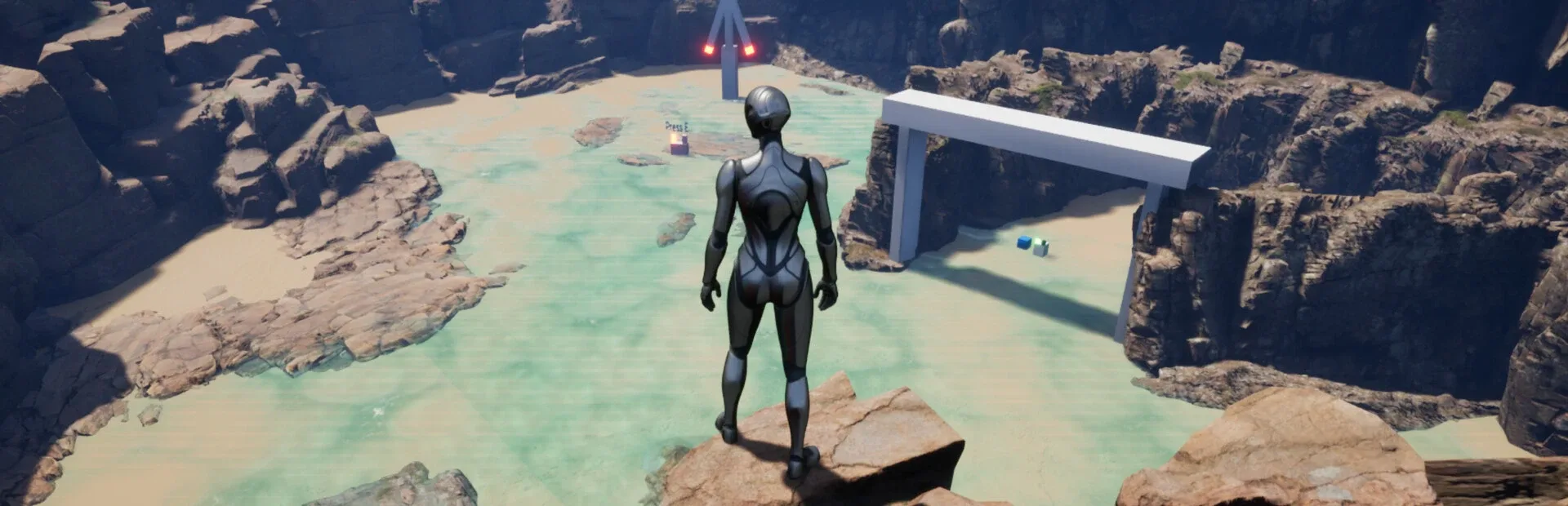 A third-person game where you press switches, open doors, and interact with objects to clear a single stage. Developed in Unreal Engine 5, it features a coastal environment with cliffs and vertical terrain. As you walk on the sand or shoreline, waves react and footprints appear.
