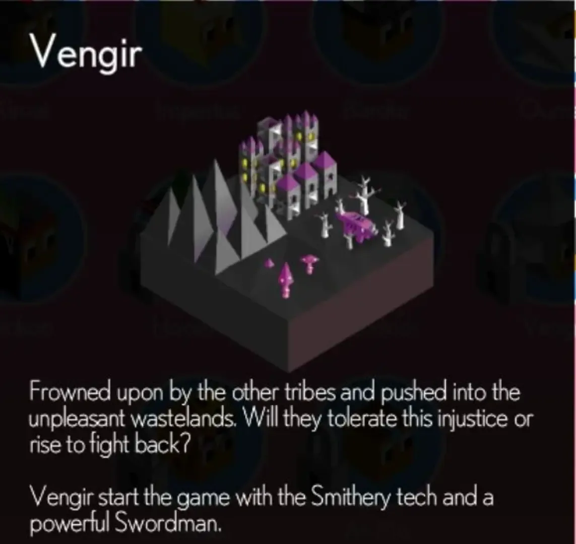 Frowned upon by the other tribes and pushed into the unpleasant wastelands. Will they tolerate this injustice or rise to fight back? Vengir Starts the game with the Smithery tech and a Powerful Swordsman.