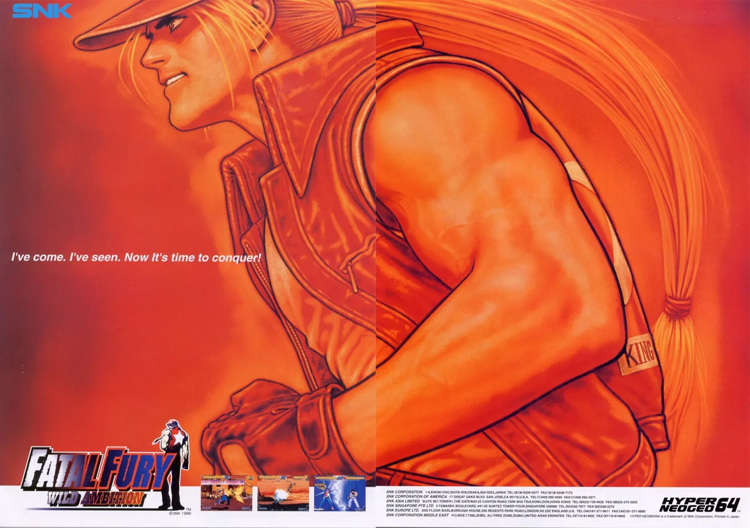 Fatal Fury: Wild Ambition re-tells the story of Terry and Andy Bogard's fight to avenge their father's death at the hands of Geese Howard with the use of a fully polygonal engine. The game is a 3D one-on-one fighting game that uses the standard Fatal Fury control scheme under a brand new 3D arena. Choose from a selection of classic Fatal Fury characters that includes 2 all-new characters, plus 2 secret guest stars. Game modes include arcade, vs, and story mode, which adds pre-rendered CGI cutscenes between certain fights.