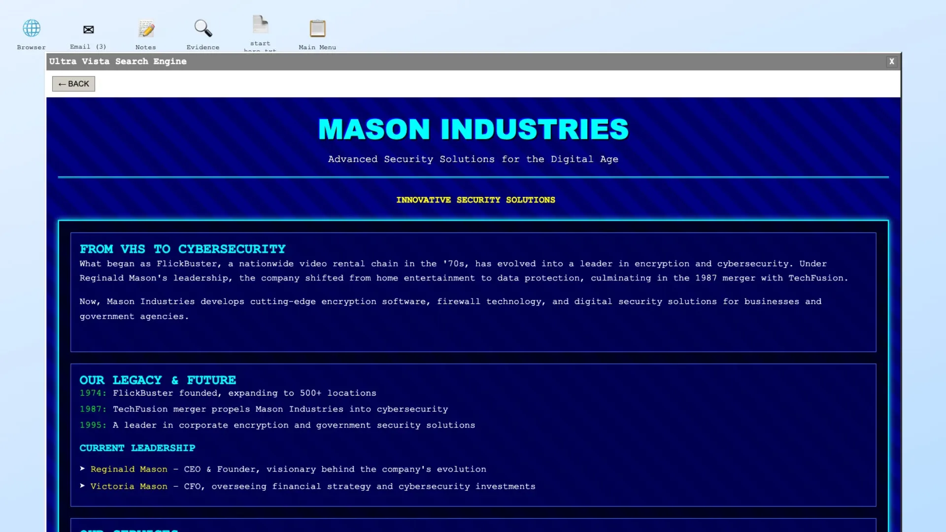 Use a 90s computer interface to search online articles, collect clues, and navigate office politics in a police procedural-style investigation to solve the case of a missing heiress in Gumshoe Detective Agency: The First Case.