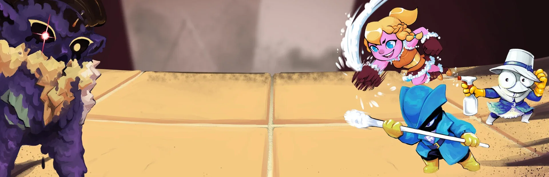 Scrubbin' Trubble is a cooperative roguelike where you go solo or team up with up to four players in local or online multiplayer to slash, smash, and scrub your way through dangerously dirty stages. Use strategy and teamwork to clean up Nasties, and take down the Four Filths of the Apocalypse.