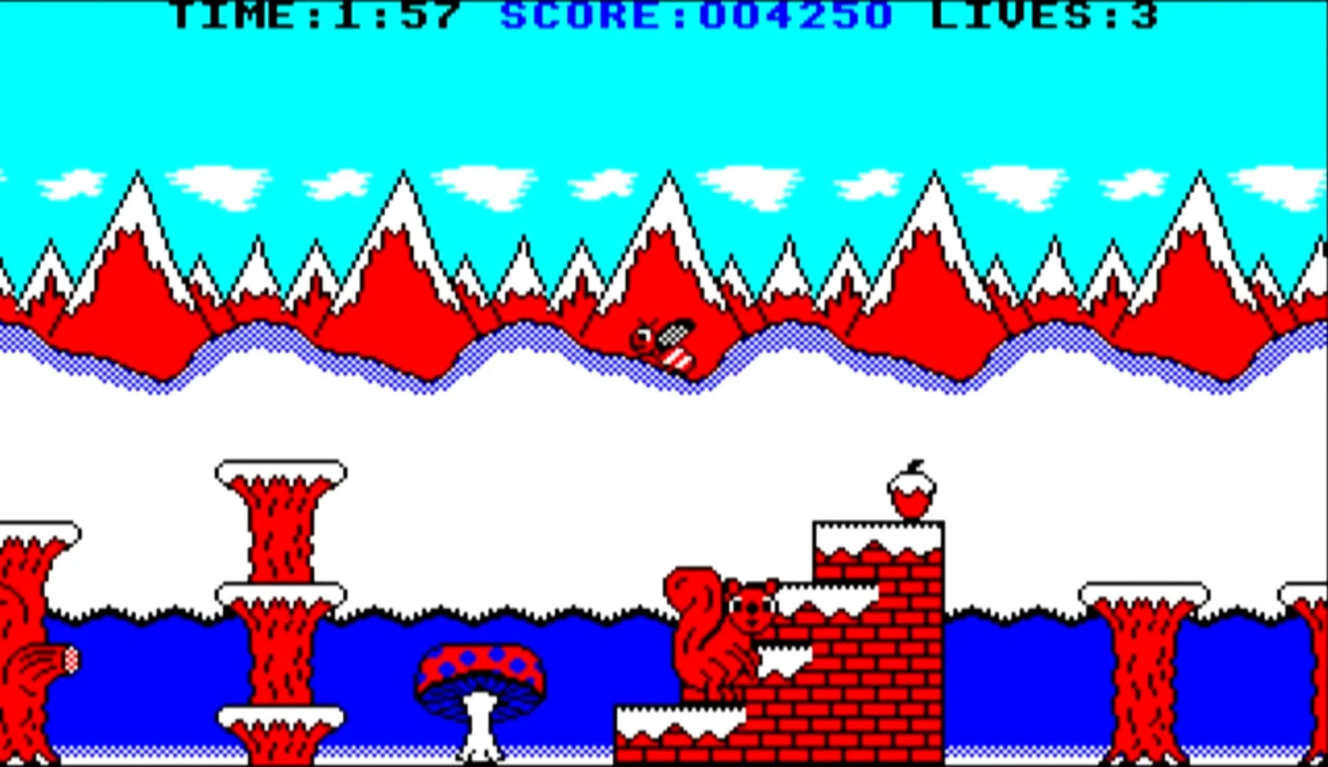 Cyril the Squirrel is due to start hibernating but has yet to collect and store all the nuts he needs to get through the winter. You play as Cyril in this platform game where the screen scrolls in both left and right directions when you move. The game is spread over eight levels and you must collect all the nuts on each level to move to the next level within a time limit.